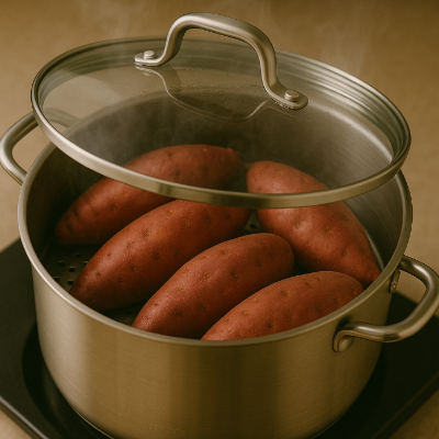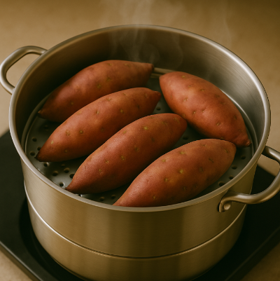냄비 대신 찜기를 사용할 수도 있습니다. 수증기로 익히는 방식이라 식감이 쫀득해지고, 영양소 파괴도 적어요. 이 또한 고구마 삶는 법에서 많이 쓰이는 방법입니다.