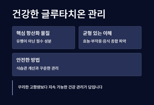 이 밖에도 글루타치온 효능은 피부 톤 개선, 노화 방지, 신경 보호, 혈액 정화, 중금속 배출 등 다양한 방향에서 작용하며, 단기간보다는 꾸준한 관리가 중요합니다.