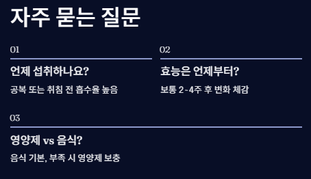 A. 공복이나 취침 전 섭취 시 흡수율이 높다고 알려져 있습니다.