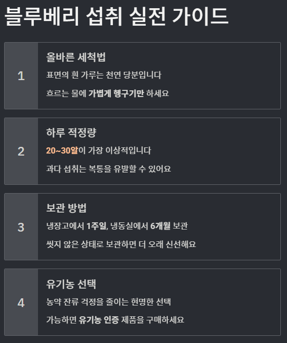 - 적정량: 아무리 좋은 블루베리라도 하루 약 20~30알 정도가 적당합니다. 블루베리 과다 섭취는 복통을 유발할 수 있습니다.