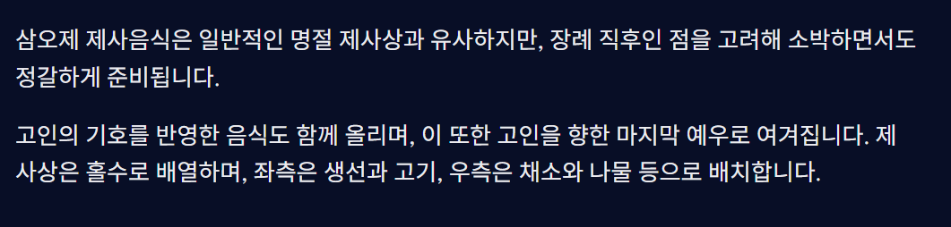 삼오제에서는 고인의 기호를 반영한 음식도 함께 올리며, 이 또한 고인을 향한 마지막 예우로 여겨집니다. 제사상은 홀수로 배열하며, 좌측은 생선과 고기, 우측은 채소와 나물 등으로 배치합니다.
