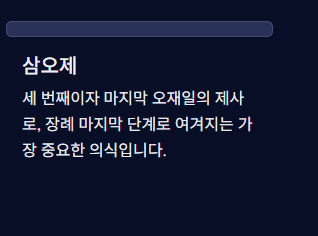 즉, 삼오제란 고인의 영혼이 이승을 떠나 천상으로 가는 길목에서 마지막으로 정성을 다해 예를 올리는 의식입니다. 삼오제는 보통 첫 오재(초오제), 두 번째 오재(재오제), 세 번째 오재(삼오제)로 나뉘며, 이 중 삼오제는 장례 마지막 단계로 여겨집니다.