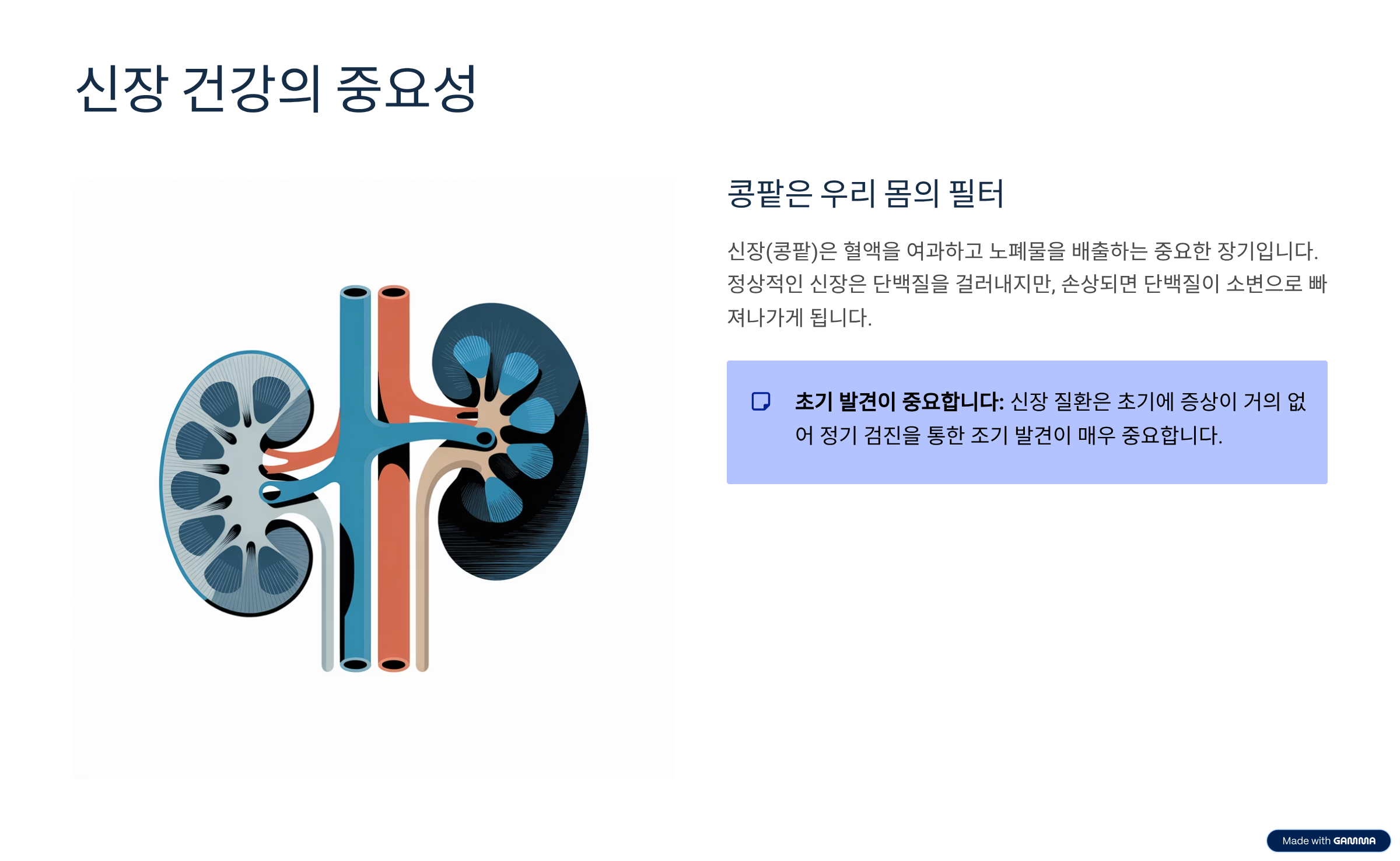 - 콩팥이 제 기능을 못 하면 노폐물 제거가 제대로 안 되며, 소변에 거품이 나는 이유가 될 수 있습니다.