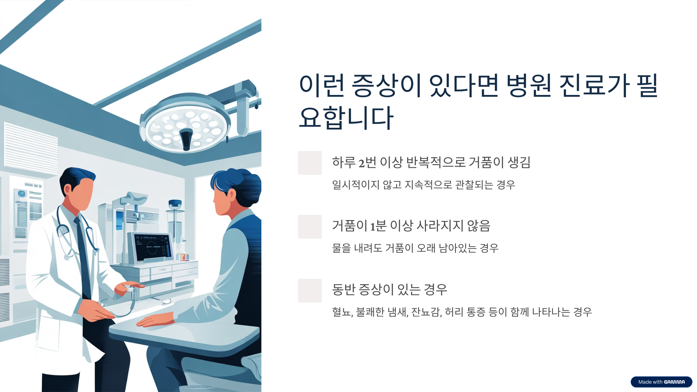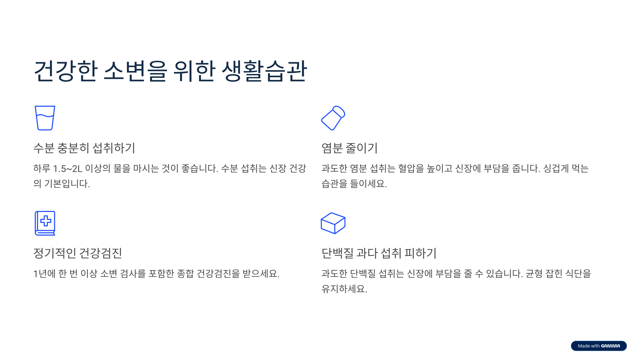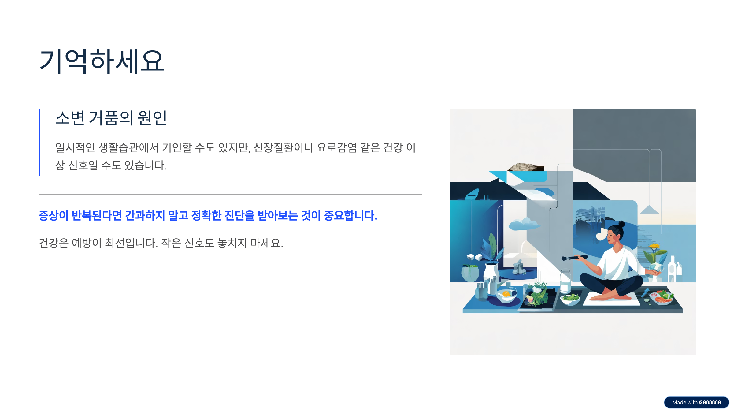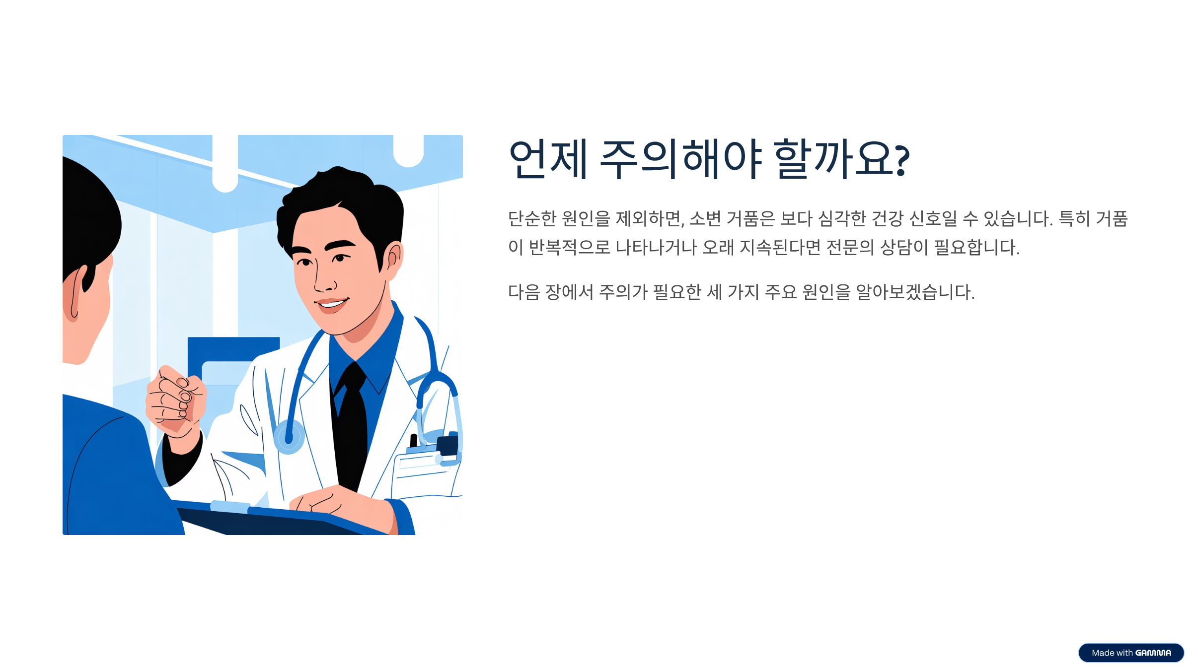 결론적으로 소변에 거품이 나는 이유는 생활습관에서 비롯될 수도 있지만, 단백뇨나 신장 질환, 감염 등 심각한 원인일 수도 있습니다. 반복적으로 나타나는 거품은 반드시 검사를 통해 확인하는 것이 중요합니다.