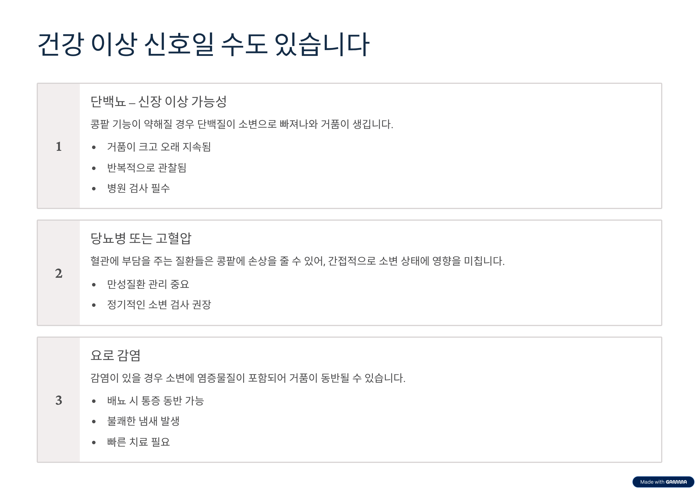 - 거품과 함께 혈뇨, 허리 통증이 나타난다면 즉시 진료가 필요합니다
