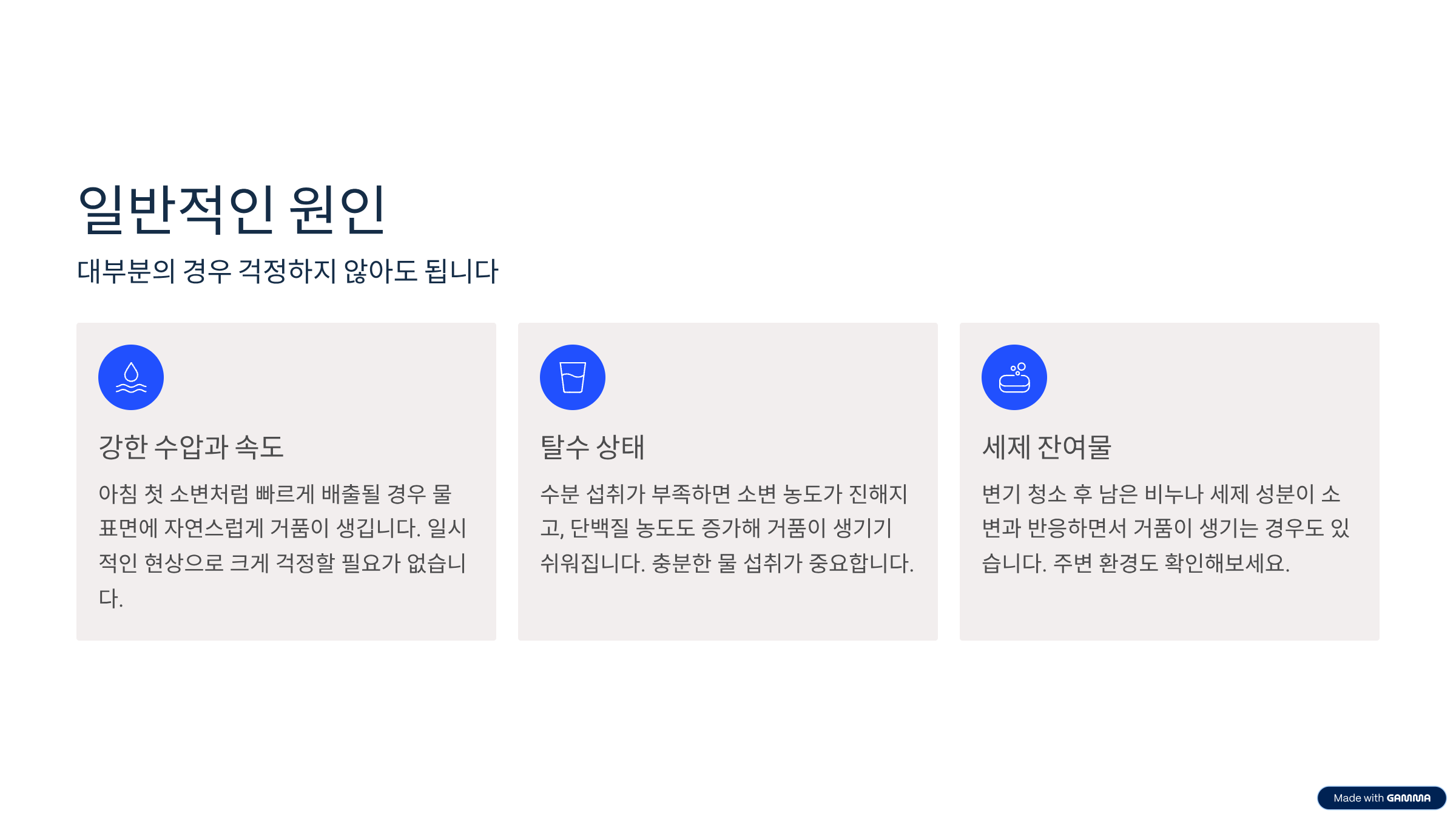 - 청소 후 남은 비누 성분이 소변과 반응해 거품이 생길 수 있습니다. 이 역시 소변에 거품이 나는 이유 중 하나입니다.
