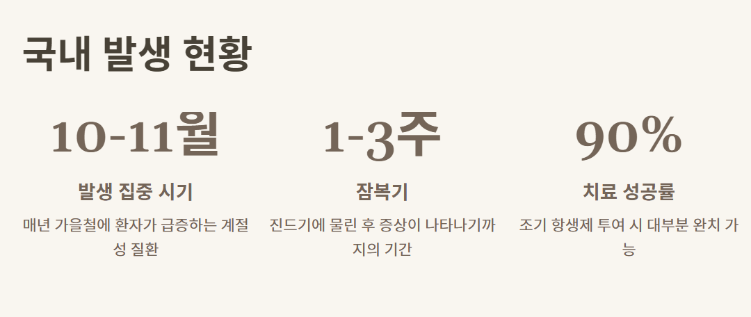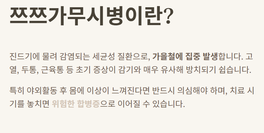 쯔쯔가무시는 가을철 진드기에 물려 감염되는 질환으로, 고열·두통·근육통 등 초기 증상이 감기와 유사해 방치되기 쉽습니다.