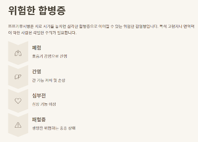쯔쯔가무시 병은 가을철 대표적인 감염 질환 중 하나로, 치료 시기를 놓치면 폐렴, 간염, 심부전 등의 심각한 합병증으로 이어질 수 있습니다. 특히 고령자나 면역력이 약한 사람은 패혈증으로 사망에 이를 수도 있어 각별한 주의가 필요합니다.