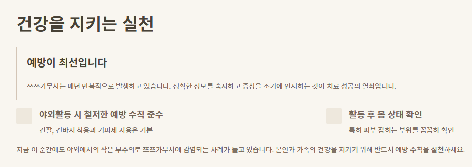 쯔쯔가무시는 예방이 최선인 질환입니다. 야외활동 전에는 진드기 기피제를 뿌리고, 노출 부위를 최소화해야 하며, 활동 후에는 반드시 몸을 확인하고 깨끗하게 씻어야 합니다. 고령자, 기저질환자, 농업 및 임업 종사자는 특히 조심해야 합니다.