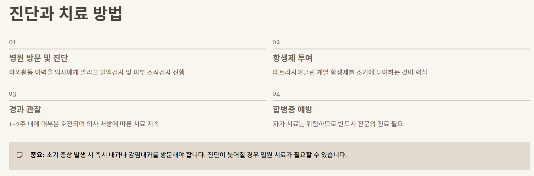 쯔쯔가무시 치료는 테트라사이클린 계열 항생제를 조기에 투여하는 것이 핵심입니다. 진단이 늦어질 경우 병세가 악화되어 입원 치료가 필요할 수 있으므로, 초기 증상 발생 시 즉시 내과나 감염내과를 방문해야 합니다.